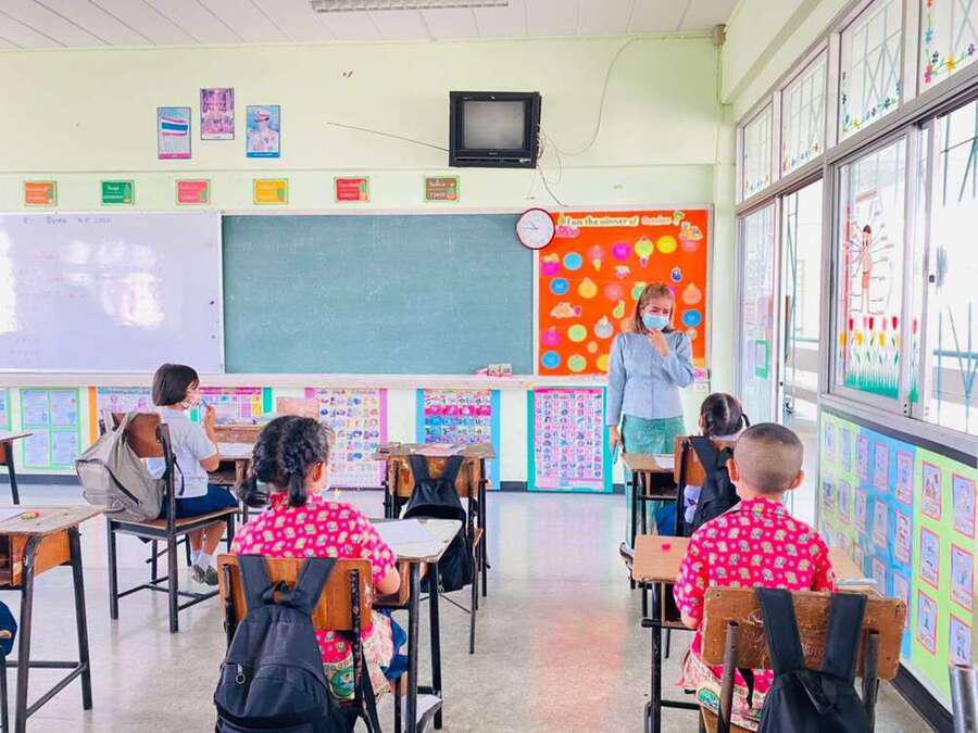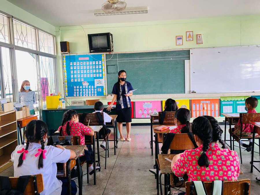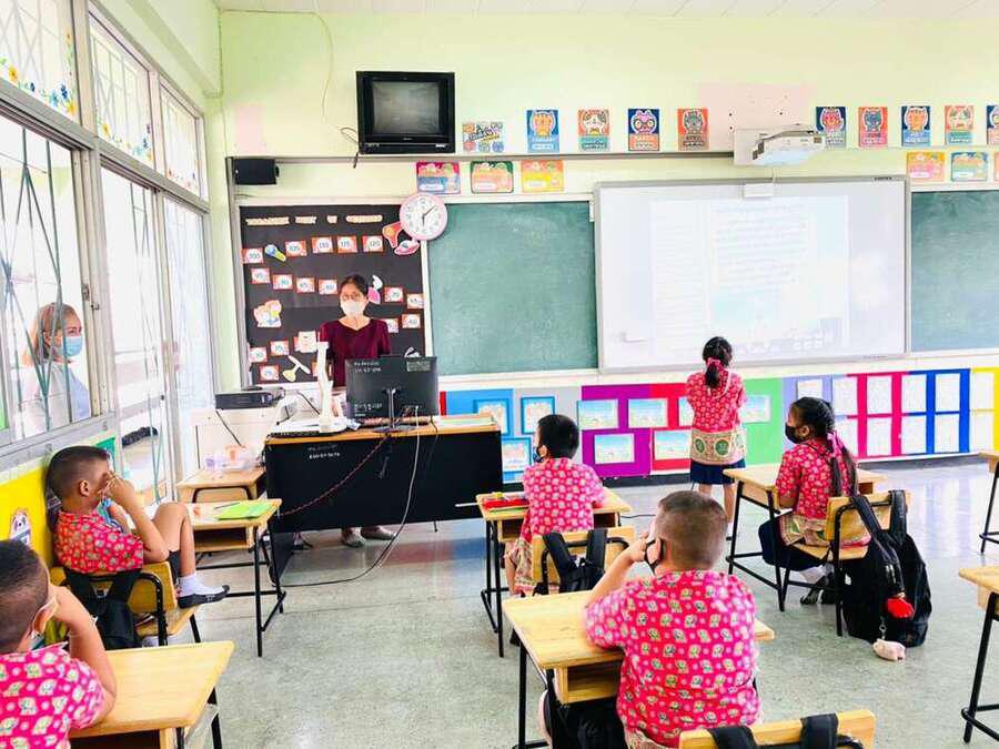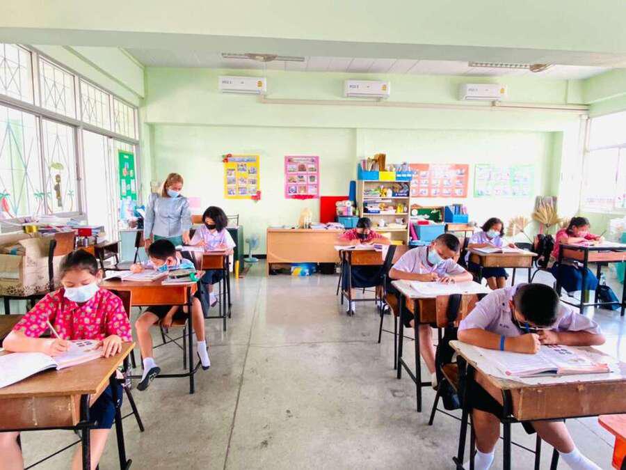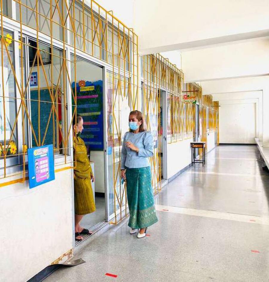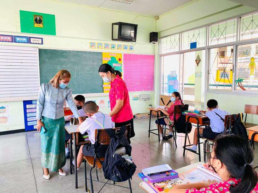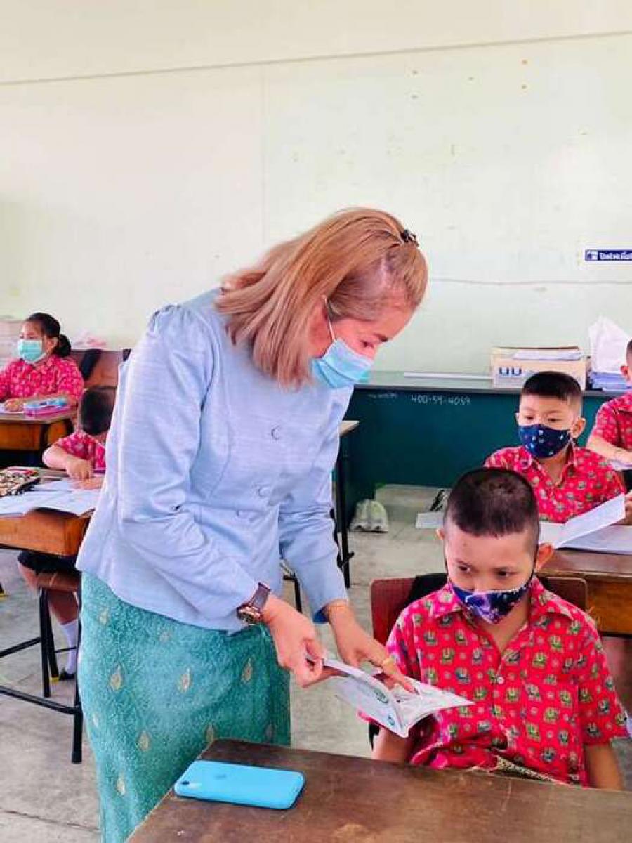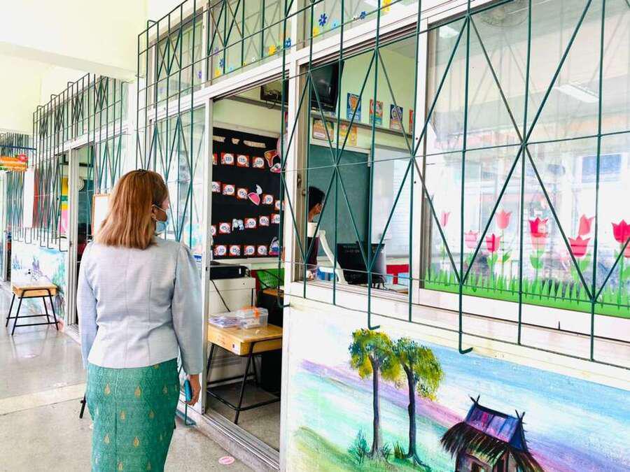 นางสาวบุษยพรรณ์ แสงไชยพัฒน์ รองผู้อำนวยการสถานศึกษา รักษาราชการในตำแหน่ง ผู้อำนวยการสถานศึกษา นิเทศการจัดการเรียนการสอนครูผู้สอน ระดับประถมศึกษา ประจำภาคเรียนที่ 2 ปีการศึกษา 2563 พร้อมให้คำแนะนำการจัดระเบียบห้องเรียนเพื่อความเป็นระเบียบเรียบร้อย และเป็นไปตามมาตรการเฝ้าระวัง ป้องกัน และควบคุมโรคCOVID-19 S:0
